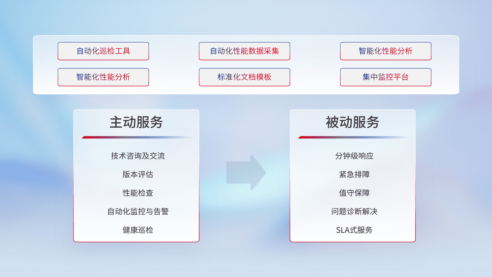 智能化工具和标准化文档,,保障服务质量,,提供主动服务(包含技术咨询、、、、版本评估、、、、性能检查、、自动化监控与告警、、健康巡检)和被动服务包含(分钟级响应、、、紧急排障、、值守保障、、、、问题诊断解决、、、SLA服务)。。